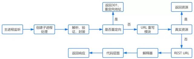 然后会查看 URL 重写规则,如果请求的文件是真实存在的,比如图片、html、css、js文件等,则会直接把这个文件返回。否则服务器会按照规则把请求重写到 一个 REST 风格的 URL 上。然后根据动态语言的脚本,来决定调用什么类型的动态文件解释器来处理这个请求。